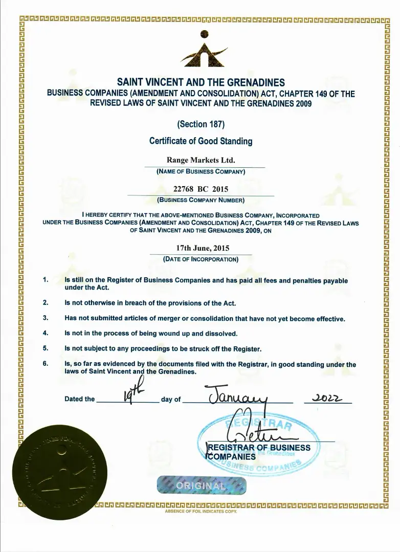 Range Markets Ltd is incorporated in St. Vincent & the Grenadines as an International Business Company with registration number 22768 IBC 2015.