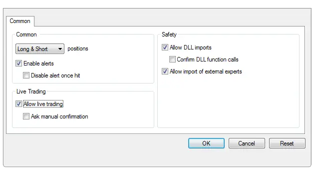 - Please note that when you activate the Expert Advisor you will see a pop up window with the setting for the EA. In those settings you should do the following: a. Tick ‘Allow live trading’ if you want the one click trading to be activated b. Tick ‘Allow DLL imports’. Please note that the ‘Confirm DLL function calls’ should be left un ticked.